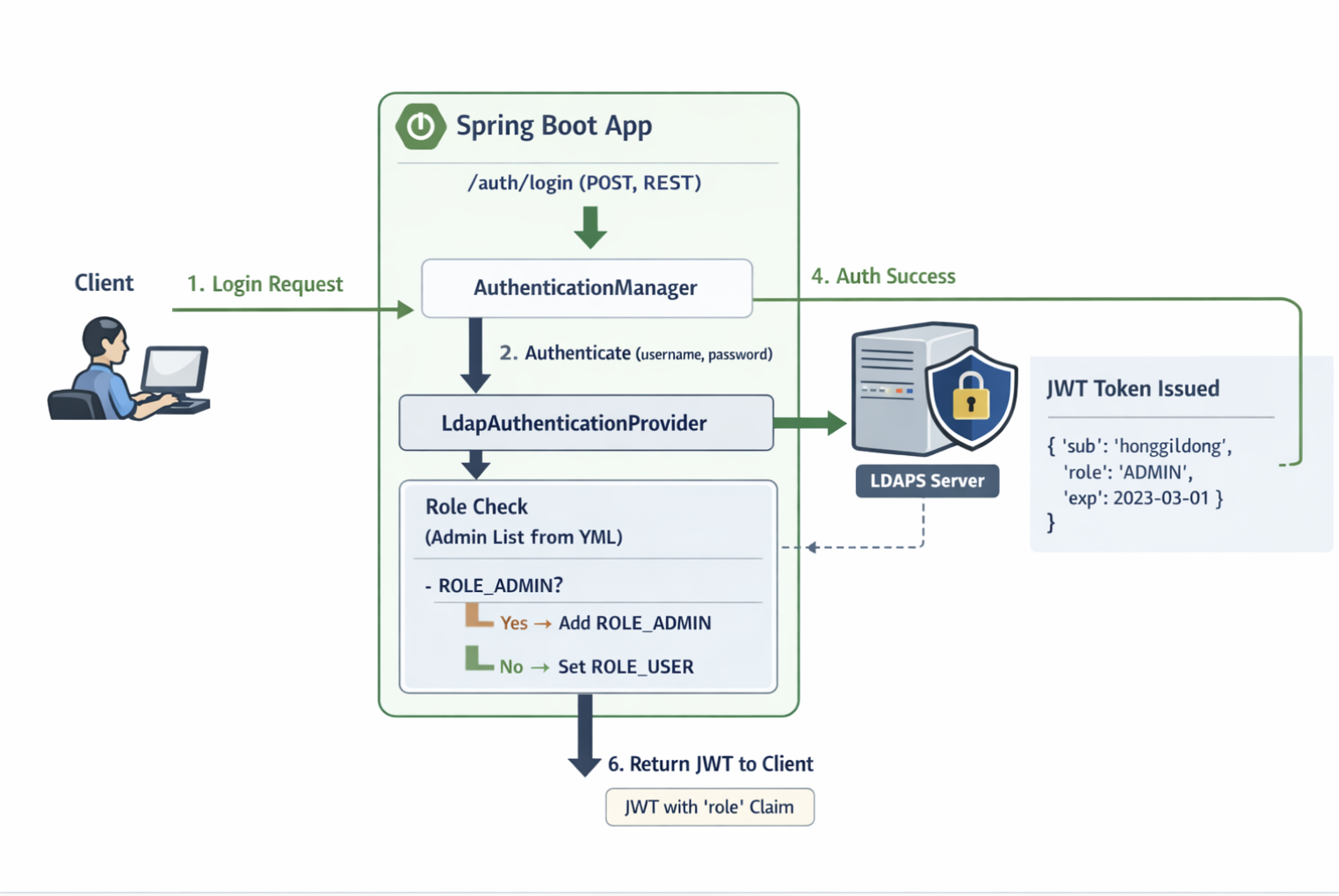 따라서 Spring Security 기반에 Ldaps를 거쳐 인증/인가가 되어야한다.